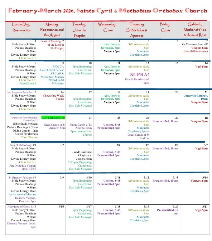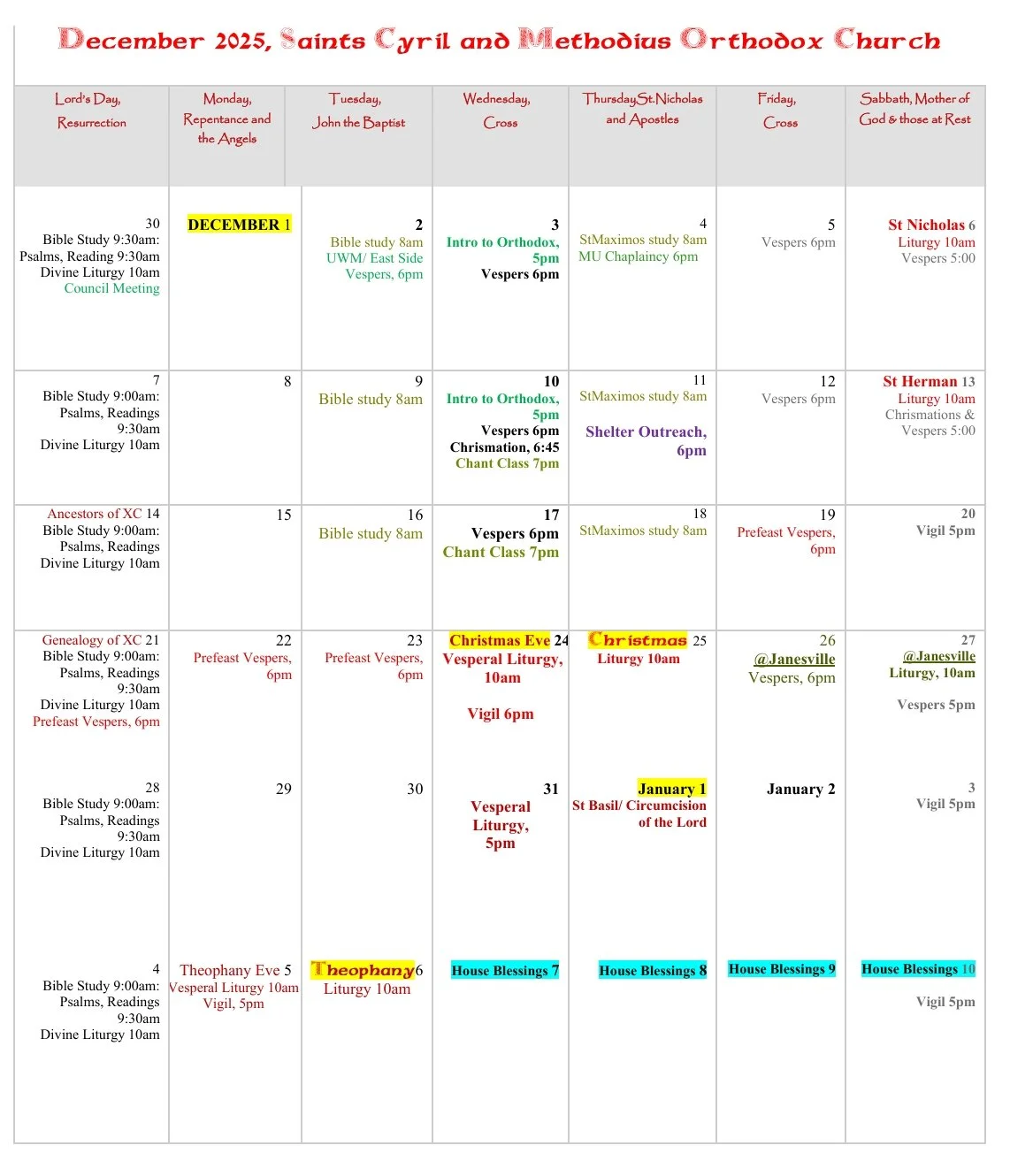 Tuesday 12/22: Bible Study (Epistles) 8:30 a.m., 7th/ Final Unction & Vesperal Liturgy, 6 p.m.