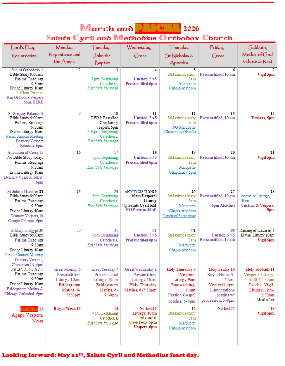 Tuesdays at 9am and 8:30pm: Bible Study / Thursdays at 9am and 8:30pm: patristic study (St. Gregory the Theologian).